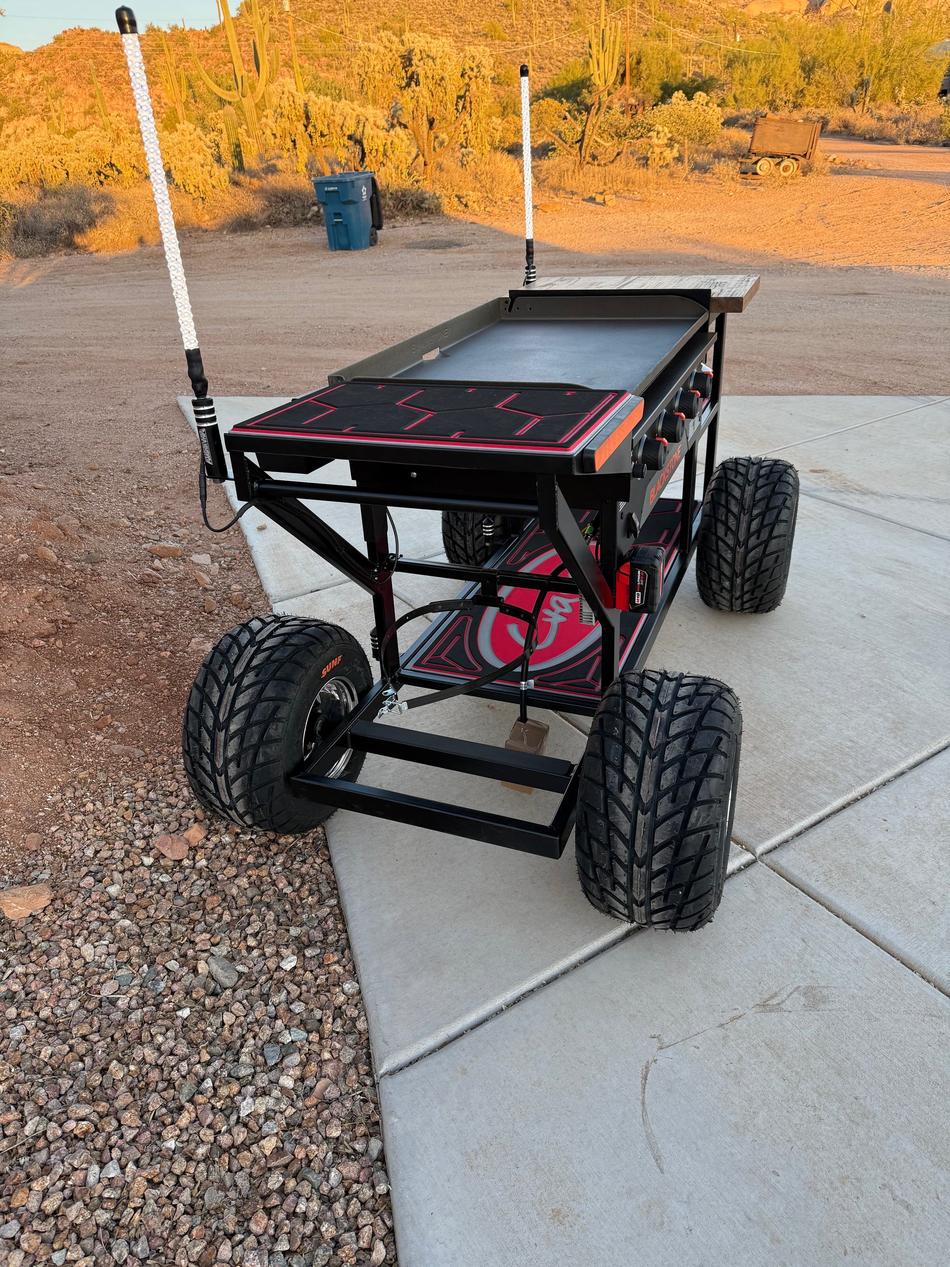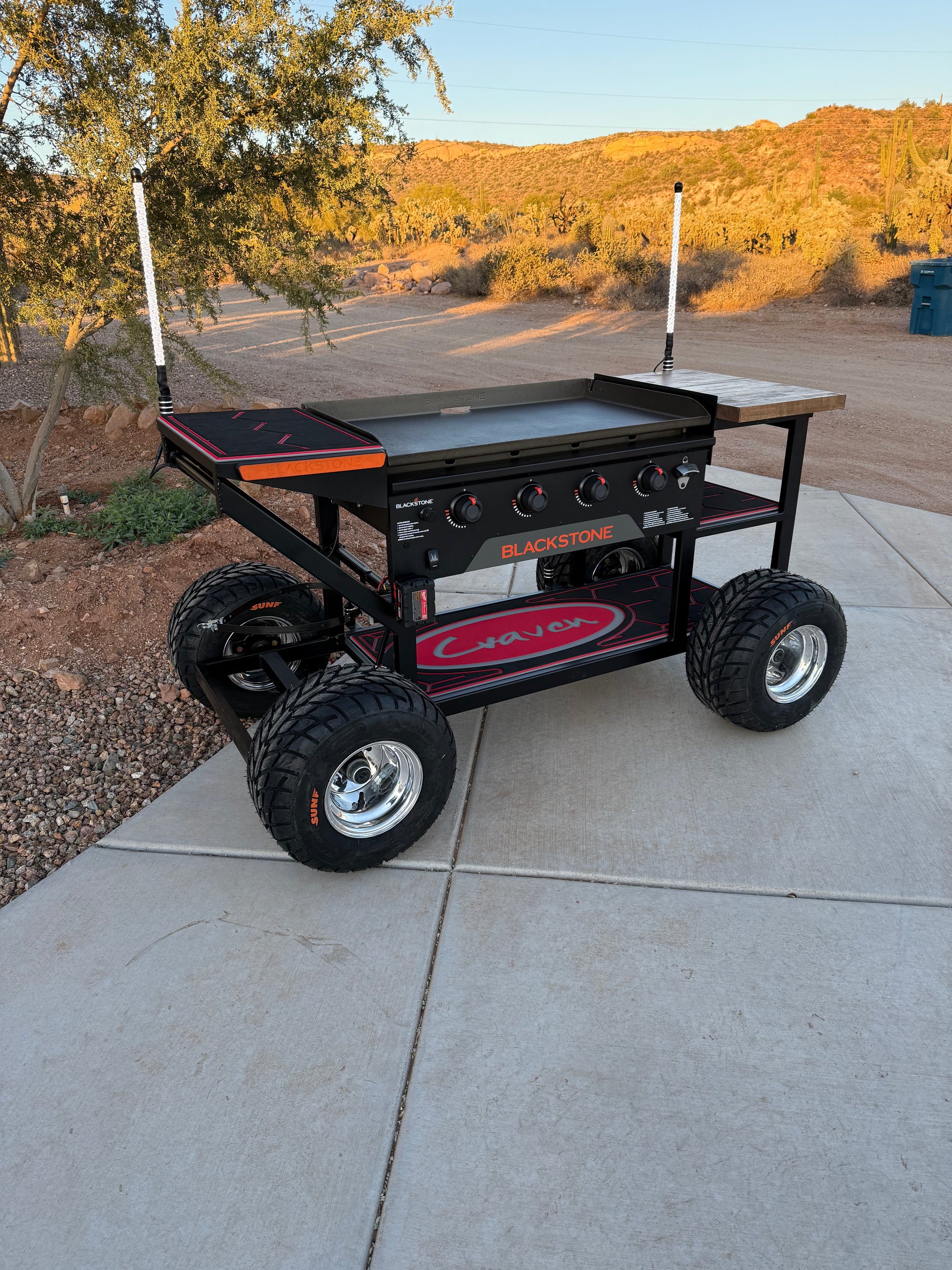 Take your outdoor cooking to the next level with the Craven Creations Off-Road Black Stone Grill. Built for adventure, this grill is designed with off-road enthusiasts in mind, featuring rugged construction and thoughtful details that make it a standout addition to your gear. With a convenient butcher block side for meal prep and integrated mounts for Marshin Whips, this grill combines functionality and style for the ultimate outdoor experience.